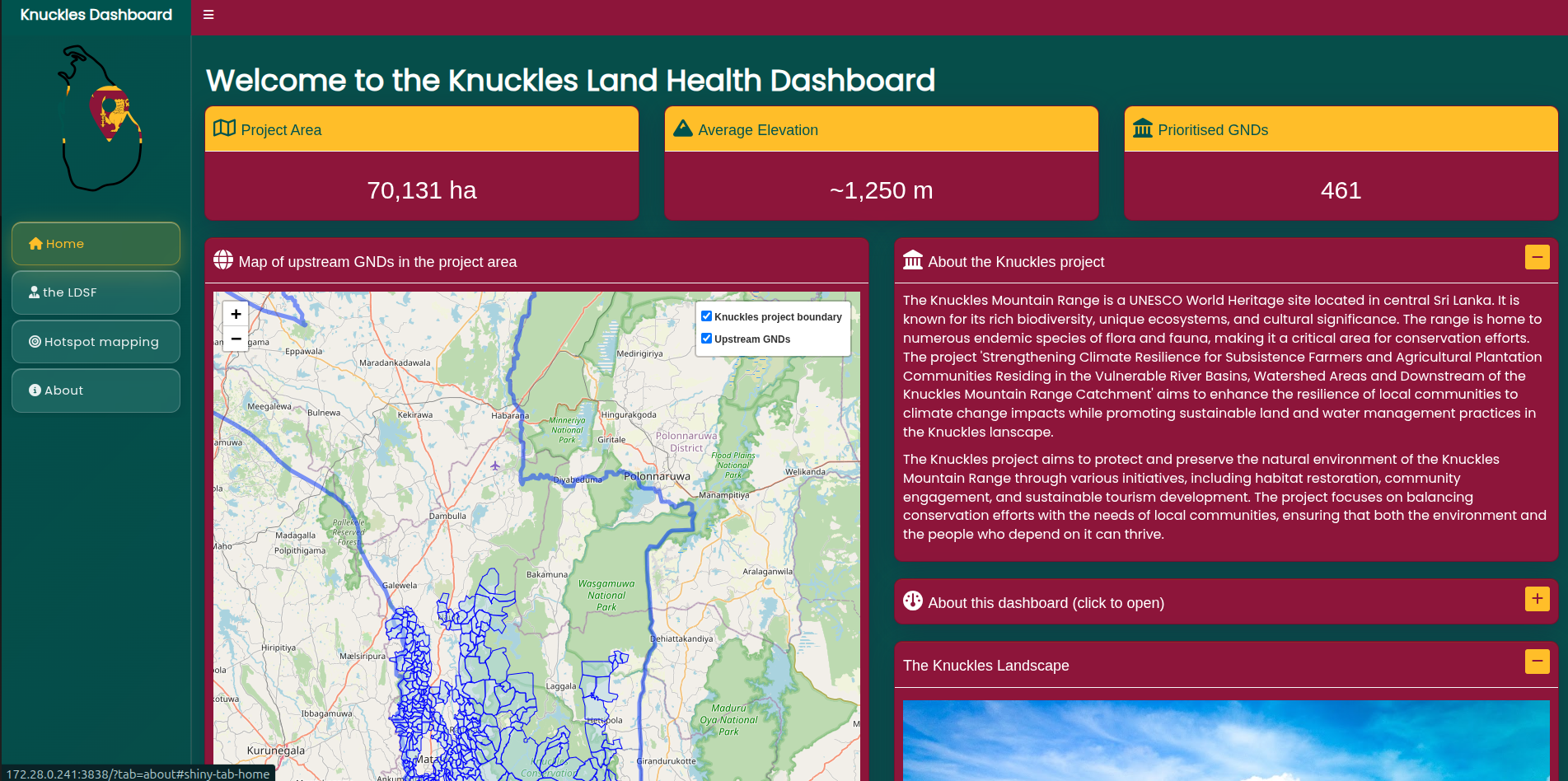 The Knuckles Dashboard is a comprehensive web-based platform for climate resilience and sustainable land management in Sri Lanka's Knuckles Mountain Range. It integrates environmental data to support conservation and community development decision-making.